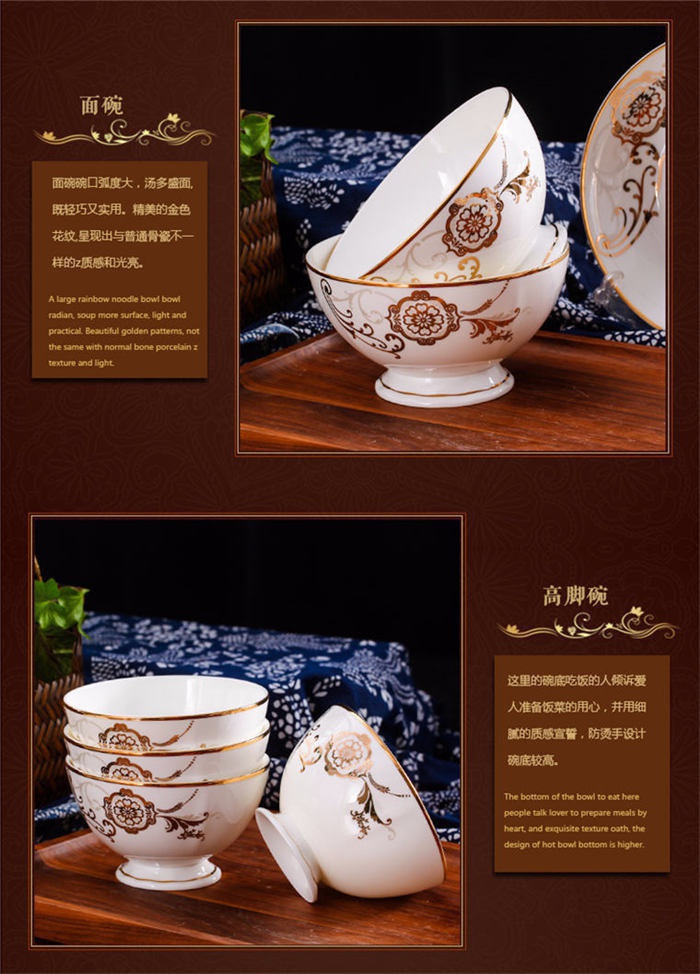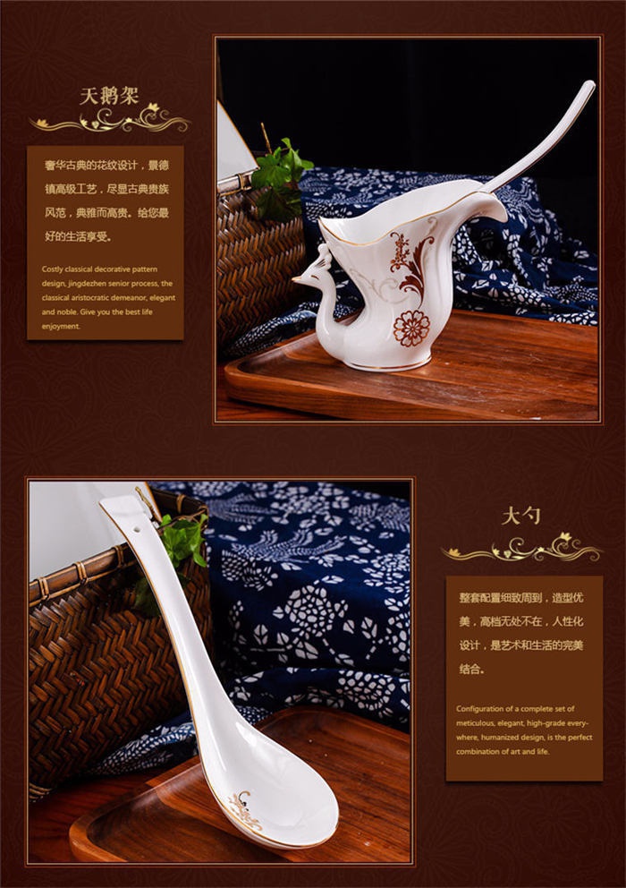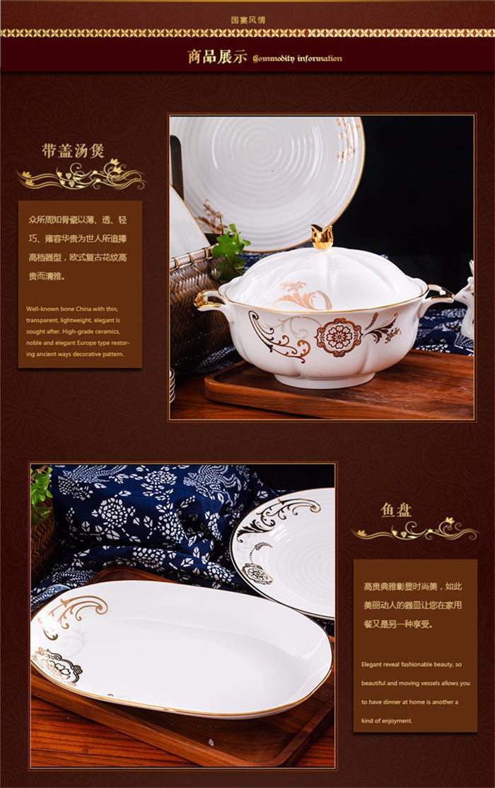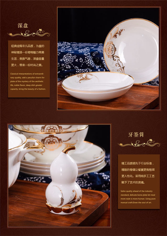 62頭黃金花開,一個湯煲,一個魚盤,一個十寸圓盤,一個飯勺,一個牙簽筒,一個煙灰缸,一個花籃,一個美鵝,四個面碗,十個八寸盤,十個4.5寸飯碗,十個五寸骨碟,十個調羹,十個筷子架。
