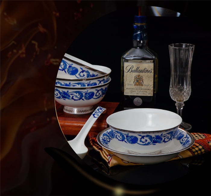 60頭德蘭城堡,一個湯煲,一個魚盤,一個十四寸圓盤,一個湯勺,一個牙簽筒,一個筷子筒,四個面碗,兩個沙拉碟,十個4.5寸飯碗,十個味碟,十個調羹,四個八寸圓盤,四個八寸方盤,十個筷子架。