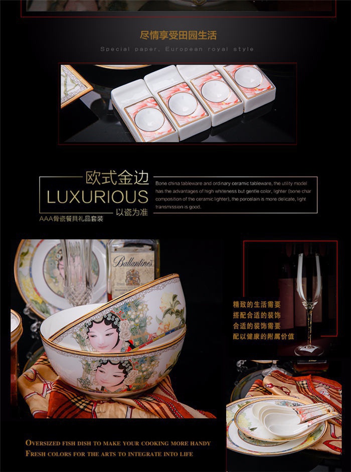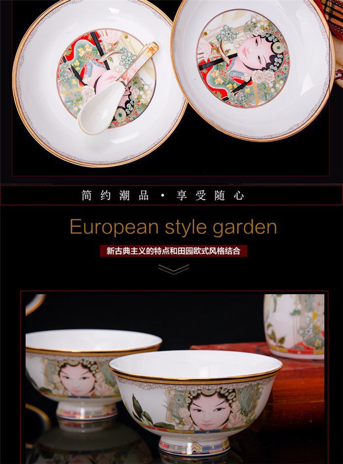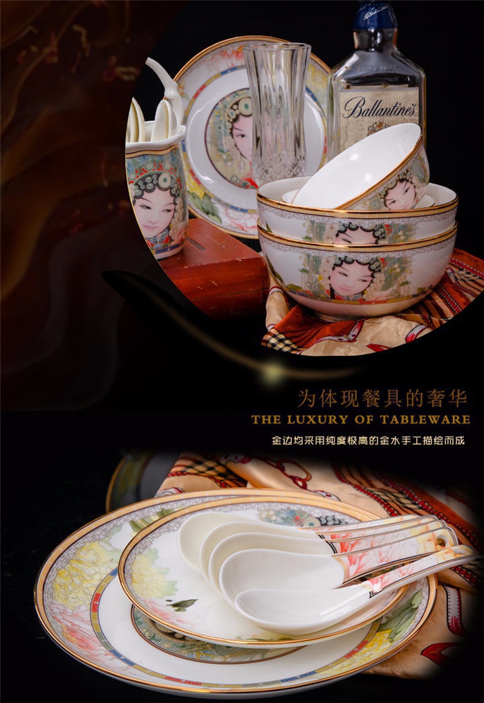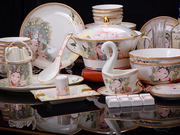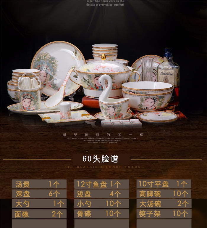 60頭臉譜,一個湯煲,一個飯勺,一個魚盤,一個十寸平盤,一個牙簽筒,一個煙灰缸,兩個面碗,兩個大湯碗,一個花籃,一個鳥,八塊八寸盤,十個4.5寸飯碗,十個骨碟,十個調羹,十個筷子架。